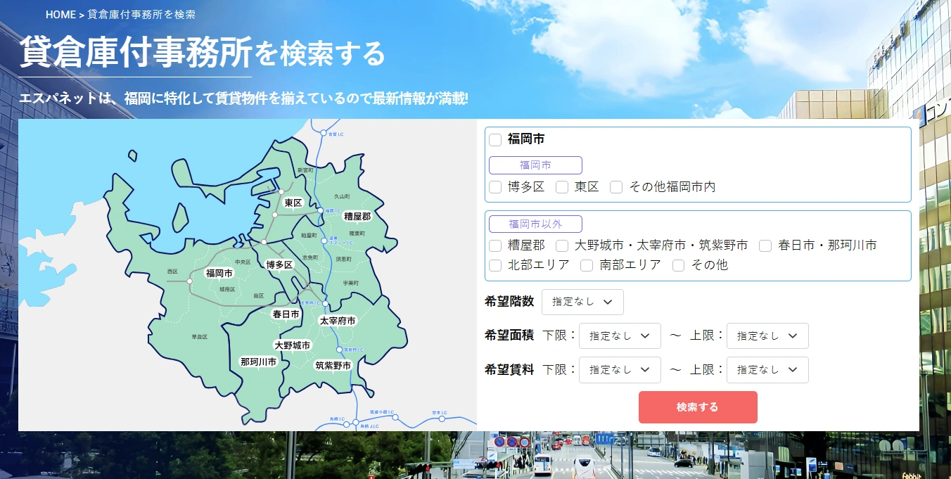 福岡市・博多区を中心に、貸倉庫・貸倉庫付事務所・貸店舗・貸事務所を幅広く紹介している専門ポータルサイト「SPANET」。福岡県内の物流・倉庫用途に適した物件情報を数多く取り扱っており、面積・賃料・駐車台数など用途に応じて条件から細かく検索できる点が強みです。