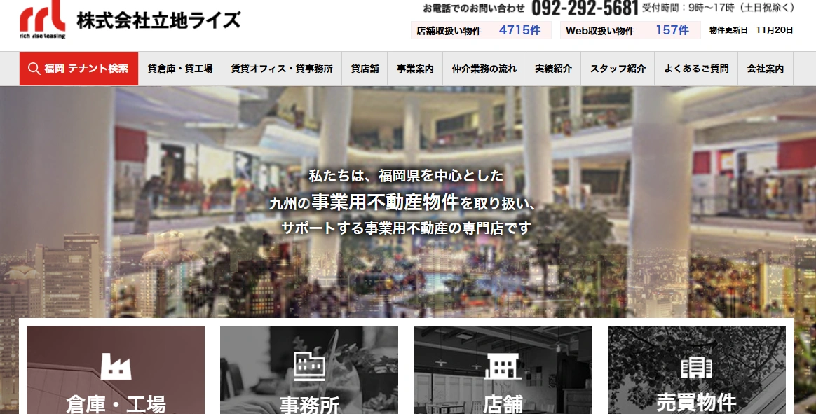 福岡県を中心に九州圏内の事業用不動産(貸倉庫・貸工場・貸店舗・貸事務所)を専門に取り扱う株式会社立地ライズ。豊富な物件情報とともに、未公開物件の取り扱いも多く、用途や面積・条件に応じて細かく検索できる点が強みです。