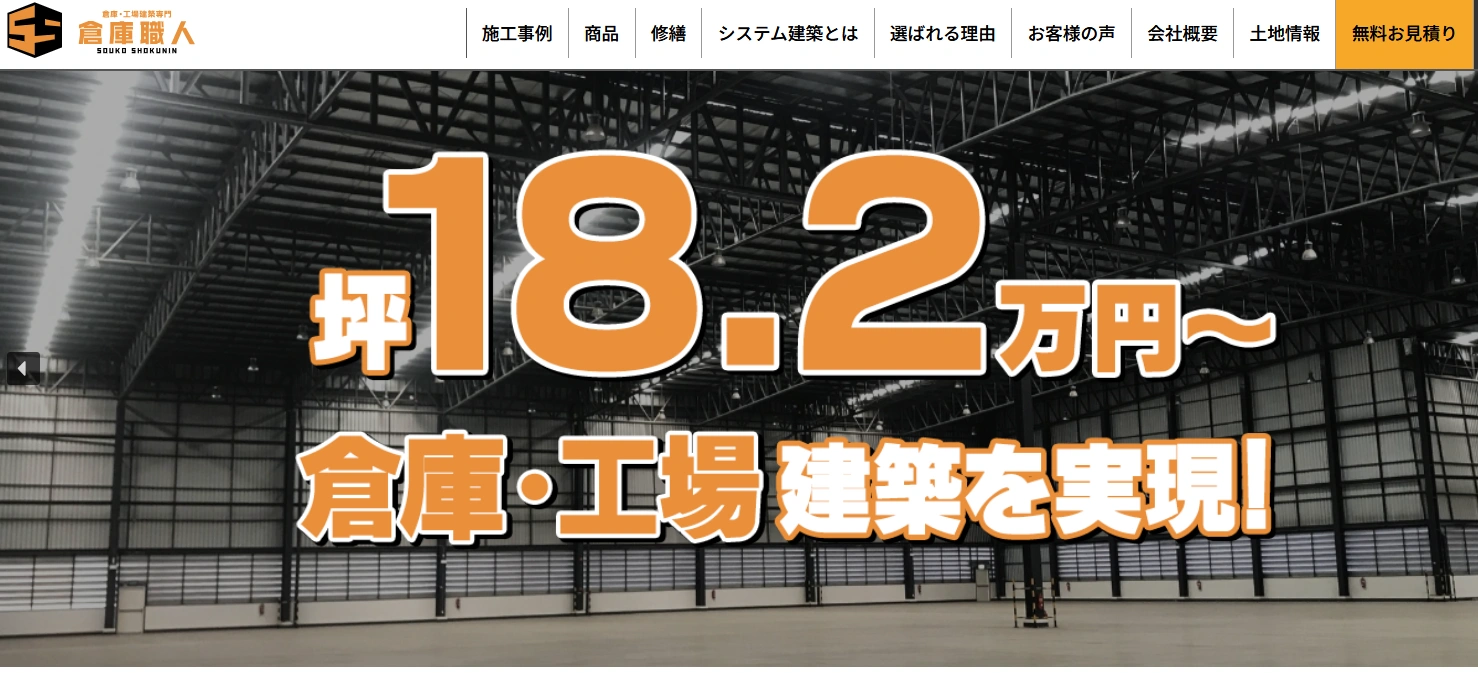 倉庫職人は、佐賀県を中心に福岡県エリアなどでも対応する倉庫・工場建築・土地探しまで含めた総合サポート会社です。「システム建築」を活用してスピーディに建築を進め、また補助金の活用相談から土地探し・運営支援までワンストップで提案してくれる点が特長です。