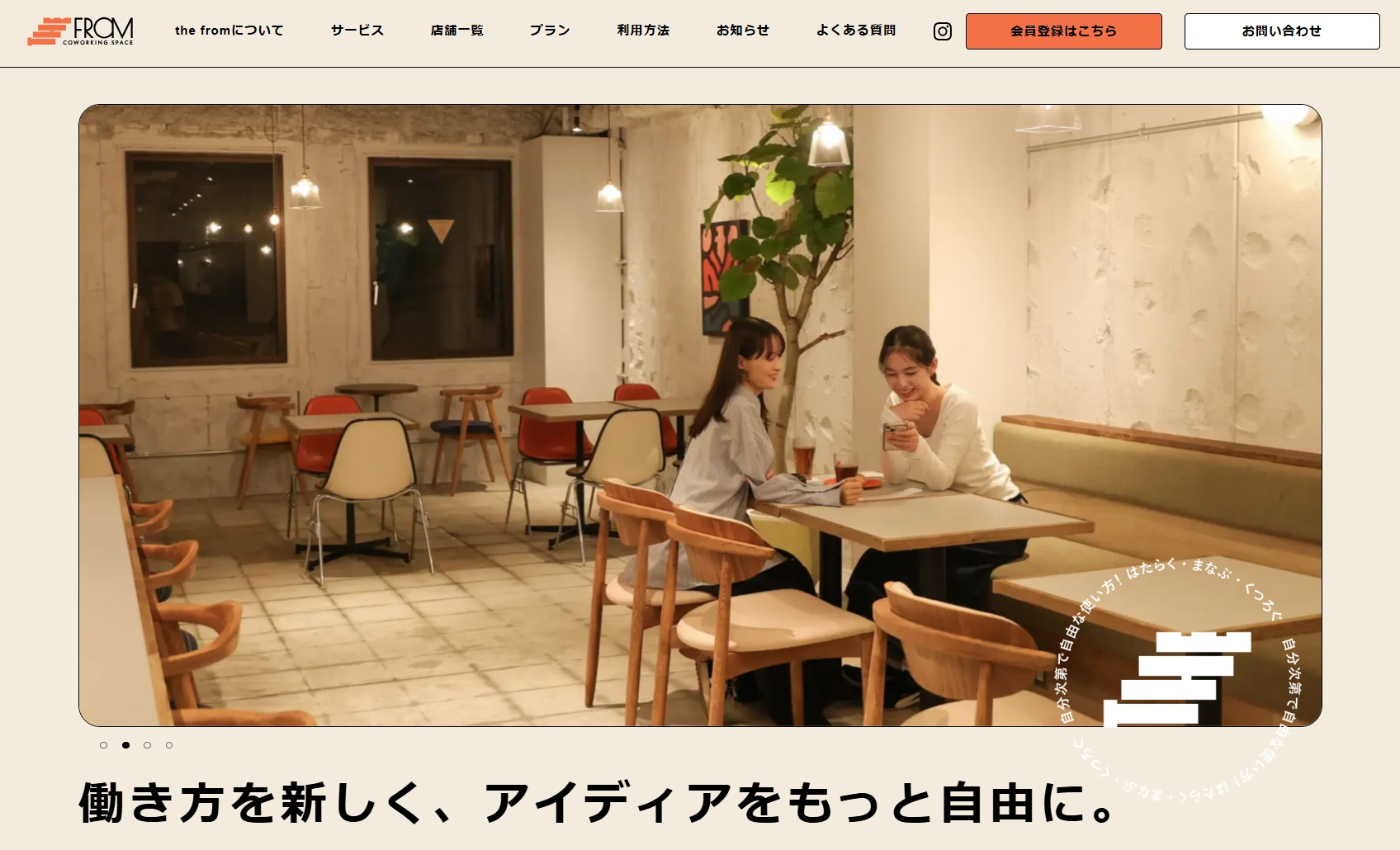 福岡市中央区・赤坂/天神エリアに位置する「the from(ザ・フロム)」は、“ワークスペース”の機能性と“カフェ”の心地よさを兼ね備えたデザイン系コワーキング&シェアオフィスです。個人利用から法人利用、バーチャルオフィス、月額使い放題プラン、1日利用(ドロップイン)まで幅広く対応。法人登記・郵便受取もOKという使い勝手の良さが特徴。