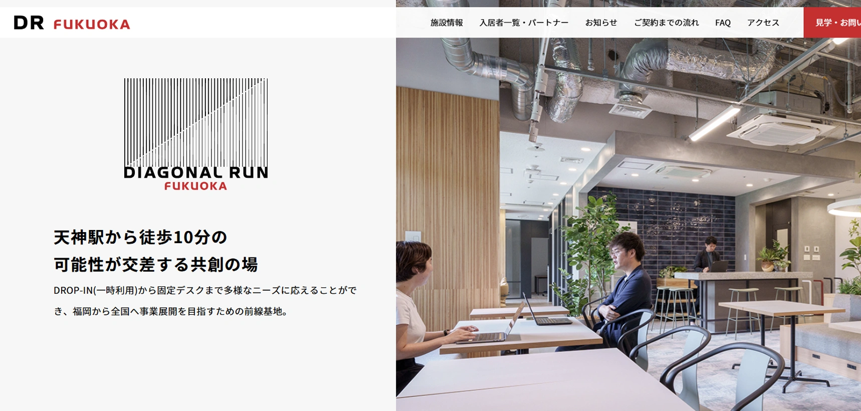 福岡市中央区・西中洲にある「DIAGONAL RUN FUKUOKA」は、地方銀行グループが運営するコワーキングスペース&シェアオフィスです。天神駅・中洲川端駅から徒歩圏内という好立地にあり、川沿いの落ち着いたロケーションで仕事に集中できる環境!